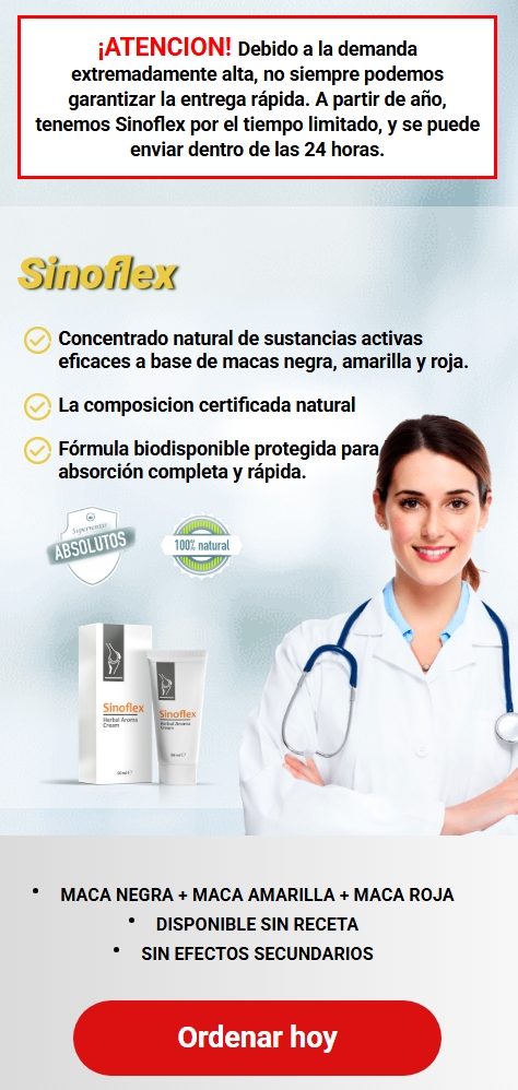 ¡ATENCIÓN! Debido a la demanda extremadamente alta, no siempre podemos garantizar la entrega rápida. Tenemos Sinoflex por tiempo limitado y podemos enviarlo dentro de las 24h. ¡SIENTA TODA LA FUERZA DE LA NATURALEZA PARA SU SALUD EN LAS ARTICULACIONES! 100% natural SINOFLEX ★ AYUDA A ELIMINAR EL DOLOR CRÓNICO Y LA INFLAMACIÓN ★ PROMUEVE UNA MAYOR FLEXIBILIDAD Y MOVILIDAD DE LAS ARTICULACIONES ★ PROMUEVE EL AUMENTO DE LA ACTIVIDAD de 1580 MXN por 790 MXN ORDENAR HOY Promoción válida mientras duren las existencias PERSONAS REALES • RESULTADOS REALES “Soy abuela de dos pequeños y me dolía tanto la espalda que no podía cargarlos. Después de un mes usando Sinoflex, vuelvo a levantarlos, abrazarlos y jugar sin miedo al dolor.” María López, 62 — Guadalajara “Trabajo de pie todo el día y mis rodillas estaban destruidas. Sinoflex fue el único que me dio alivio real. Hoy camino sin cojear y con energía.” Ana Castillo, 45 — Monterrey “Tenía inflamación en mis manos por años. No podía ni abrir frascos ni cocinar. Sinoflex devolvió la movilidad a mis dedos y mi vida diaria es mucho más fácil.” Lucía Hernández, 54 — Puebla “Me despertaba con dolor en la cadera todos los días. Probé de todo. Sinoflex fue lo único que realmente calmó la inflamación. Duermo y camino sin dolor.” Rosa Martínez, 59 — Ciudad de México ¿QUÉ ES SINOFLEX? La fórmula innovadora de Sinoflex fue desarrollada por científicos y contiene poderosos ingredientes naturales: maca negra, amarilla, roja, extractos de uña de gato (uncaria), aloe, ginseng, ortiga, probióticos y un rico complejo vitamínico. Las pruebas clínicas y de laboratorio han demostrado la seguridad y alta eficacia de las cápsulas en diversas enfermedades de las articulaciones y la columna vertebral. El uso regular de las cápsulas ayudará a aliviar la inflamación y el dolor en las articulaciones, mejorará la circulación sanguínea, eliminará la hinchazón, restaurará las fibras conectivas en las articulaciones y la producción natural de colágeno, y evitará el desarrollo de procesos patológicos. El uso regular como parte de un ciclo de aplicación puede aumentar la elasticidad del cartílago y restaurar la movilidad de las articulaciones. Los compradores confirman: ¡Sinoflex es la mejor manera de vivir una vida activa y alegre sin dolor ni molestias! ¿POR QUÉ DEBE PEDIR SINOFLEX? Los estándares estrictos de la industria se aplican al desarrollo, producción e investigación de Sinoflex, como cualquier de nuestros otros productos. Nuestra amplia experiencia en todas las etapas de la producción de productos nutracéuticos de alta calidad nos ha permitido desarrollar la primera fórmula verdaderamente biodisponible, que será absorbida de manera uniforme y completa por los tejidos en cada aplicación y alcanzará rápidamente el sitio de la inflamación.